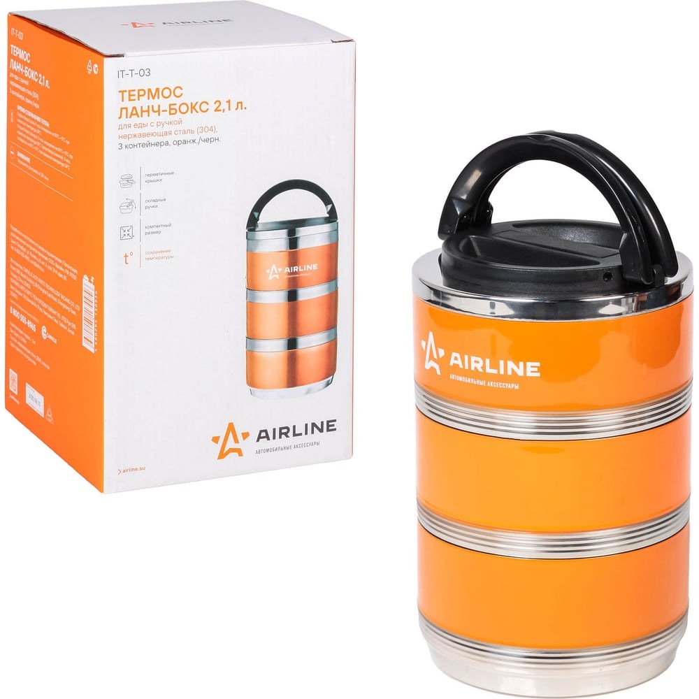 Термос AIRLINE ланч-бокс для еды с ручкой, нержавеющая сталь 304, 3 контейнера, 2.1 л, оранжевый/черный IT-T-03 - это вид бытовой теплоизоляционной посуды для продолжительного сохранения более высокой или низкой температуры продуктов питания, по сравнению с температурой окружающей среды. Представляет собой общую 2,1 литровую ёмкость из 304 нержавеющей стали с двойными стенками и герметичной теплоизолированной крышкой со складной ручкой. Термос состоит из трех соединяемых между собой круглых контейнеров без горла, удобных для приема пищи. Контейнеры имеют пластиковые крышки оснащенные воздушным клапаном. Их так же можно использовать независимо друг от друга. Этот термос отлично подходит для одновременного хранения различного рода еды. Например: первые, вторые и третьи блюда. Термос будет полезен в домашнем быту, на работе и незаменим в дальних поездках. Рекомендуется: Перед заполнением ланч-бокса ополоснуть его внутри теплой водой и отдельно смочить пластиковые крышки. С целью исключения повреждения не рекомендуется внутреннюю поверхность сосудов чистить щетками или различными порошками. После использования необходимо тщательно вымыть ланч-бокс с крышками, а после, не закрывая, поставить сушиться. Внимание: Запрещается мыть изделие в посудомоечной машине. Не кипятите крышки. Храните и перемещайте изделие в вертикальном положении. Не разогревай...
