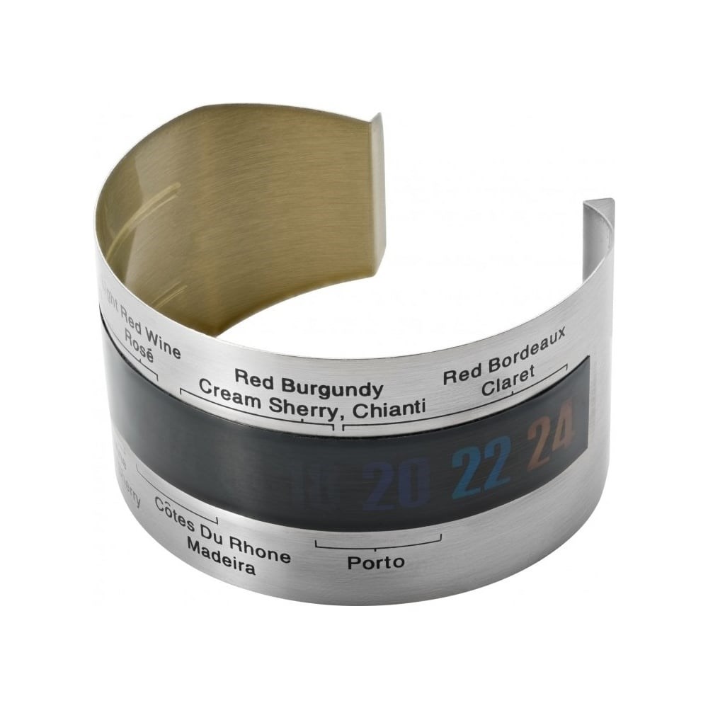 Термометр предназначен для измерения внешней температуры вина в бутылках. Термометр измеряет температуру в диапазоне от 4°С до 24°С и подходит для бутылок разного размера. На изделие нанесена шкала с указанием рекомендуемой оптимальной температуры хранения и подачи напитков. Термометр не является электрическим прибором и работает без использования батареек или внутренних аккумуляторов. Материал изготовления: нержавеющая сталь 430, LCD-дисплей.