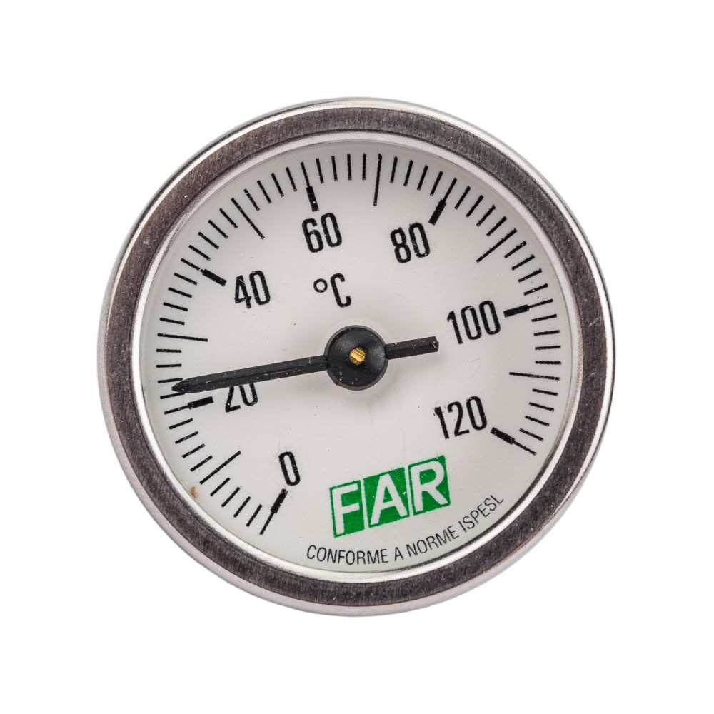 Термометр FAR FA 2650 предназначен для контроля текущей температуры теплоносителя в различных системах водяного отопления. Устанавливается с помощью наружной присоединительной резьбы 3/8" в коллекторных блоках, насосно-смесительных узлах. Корпус выполнен из биметаллического сплава, прослужит долгое время. Длина зонда - 36 мм.