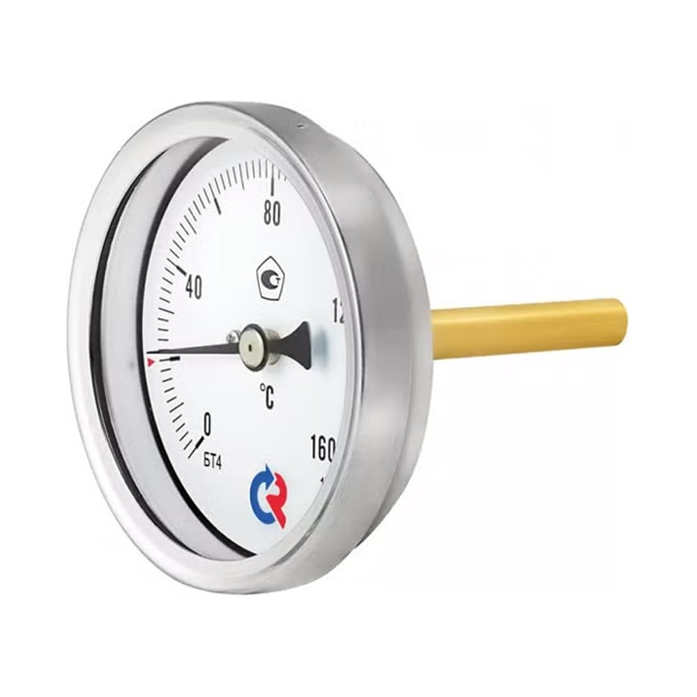 Термометр осевой РОСМА БТ-41.211 с защитной латунной гильзой предназначен для измерения температуры жидкостей, пара и газов в отопительных и санитарных установках, в системах кондиционирования и вентиляции. Принцип действия прибора основан на зависимости деформации чувствительного элемента от измеряемой температуры. В качестве чувствительного элемента используется биметаллическая пружина. Она изготавливается из двух прочно соединенных металлических пластин, имеющих различные температурные коэффициенты линейного расширения. При изменении температуры пружина изгибается и вращает стрелку термометра. Один её конец закреплен внутри штока, а к другому присоединяется ось стрелки. Область применения: системы кондиционирования, теплоснабжения, водоснабжения. Корпус: коррозионностойкая сталь 12Х15Г9НД Кольцо: коррозионностойкая сталь 12Х15Г9НД Чувствительный элемент: биметаллическая спираль Стекло: минеральное Межповерочный интервал: 3 года Климатическое исполнение: группа C2 по ГОСТ Р 52931; климатическое исполнение УХЛ категории 2.1 по ГОСТ 15150 Товар может отличаться от представленного на фото, при выборе ориентируйтесь на технические характеристики.