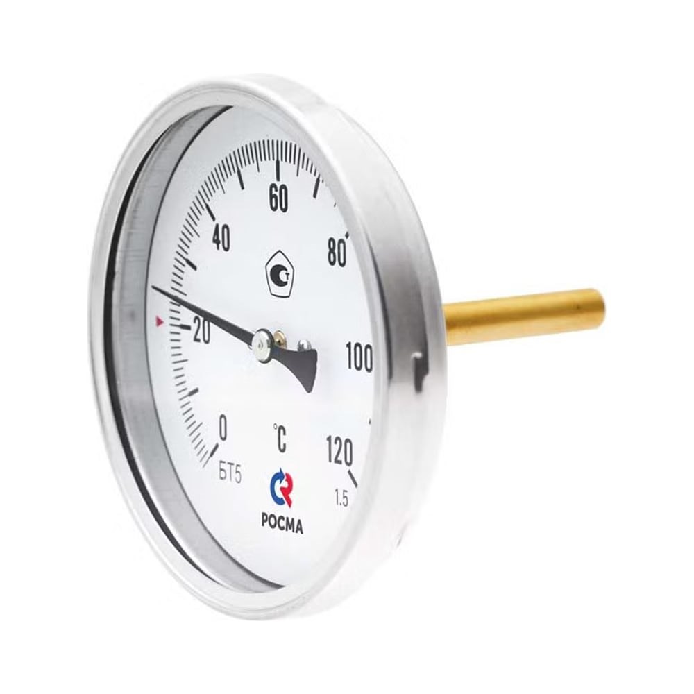 Термометр осевой РОСМА БТ-51.211 с защитной латунной гильзой предназначен для измерения температуры жидкостей, пара и газов в отопительных и санитарных установках, в системах кондиционирования и вентиляции. Принцип действия прибора основан на зависимости деформации чувствительного элемента от измеряемой температуры. В качестве чувствительного элемента используется биметаллическая пружина. Она изготавливается из двух прочно соединенных металлических пластин, имеющих различные температурные коэффициенты линейного расширения. При изменении температуры пружина изгибается и вращает стрелку термометра. Один её конец закреплен внутри штока, а к другому присоединяется ось стрелки. Область применения: системы кондиционирования, теплоснабжения, водоснабжения. Корпус: коррозионностойкая сталь 12Х15Г9НД Кольцо: коррозионностойкая сталь 12Х15Г9НД Чувствительный элемент: биметаллическая спираль Стекло: минеральное Межповерочный интервал: 3 года Климатическое исполнение: группа C2 по ГОСТ Р 52931; климатическое исполнение УХЛ категории 2.1 по ГОСТ 15150 Товар может отличаться от представленного на фото, при выборе ориентируйтесь на технические характеристики.