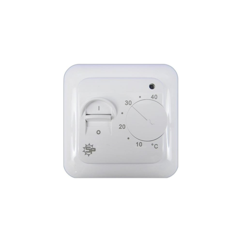 Терморегулятор SPT-1 Sun Power Film предназначен для управления температурой электрического теплого пола в диапазоне от +5°С до +40°С. Корпус изготовлен из самозатухающего материала ПВХ белого цвета, исключающего возможность возгорания от короткого замыкания. Светодиодный индикатор терморегулятора светится при включенном состоянии системы нагрева. Терморегулятор Sun Power Film MST-1 снабжен датчиком температуры пола NTS длиной 3 м. Монтируется на стене в стандартную монтажную коробку.