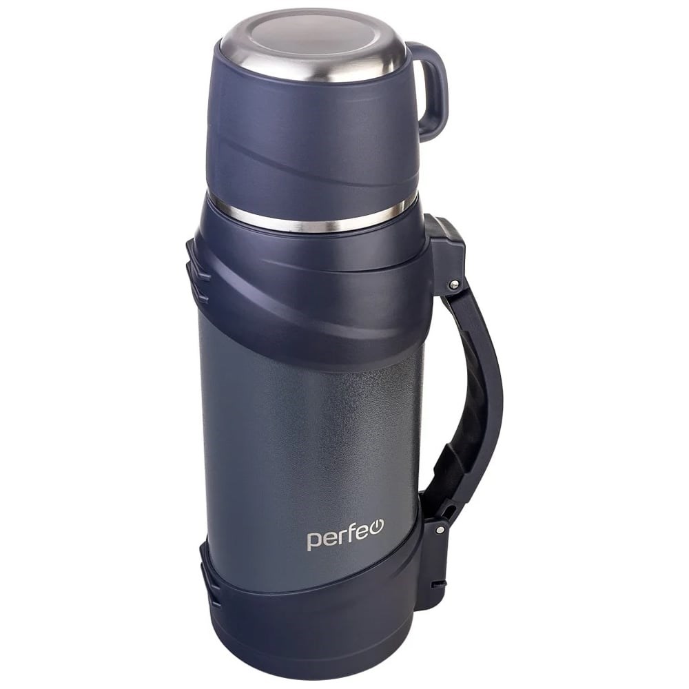 Термос для напитков Perfeo PF_E1364 с крышкой-поилкой, ситечком, чашкой, ручкой, ремнем, 1.6 л, серый