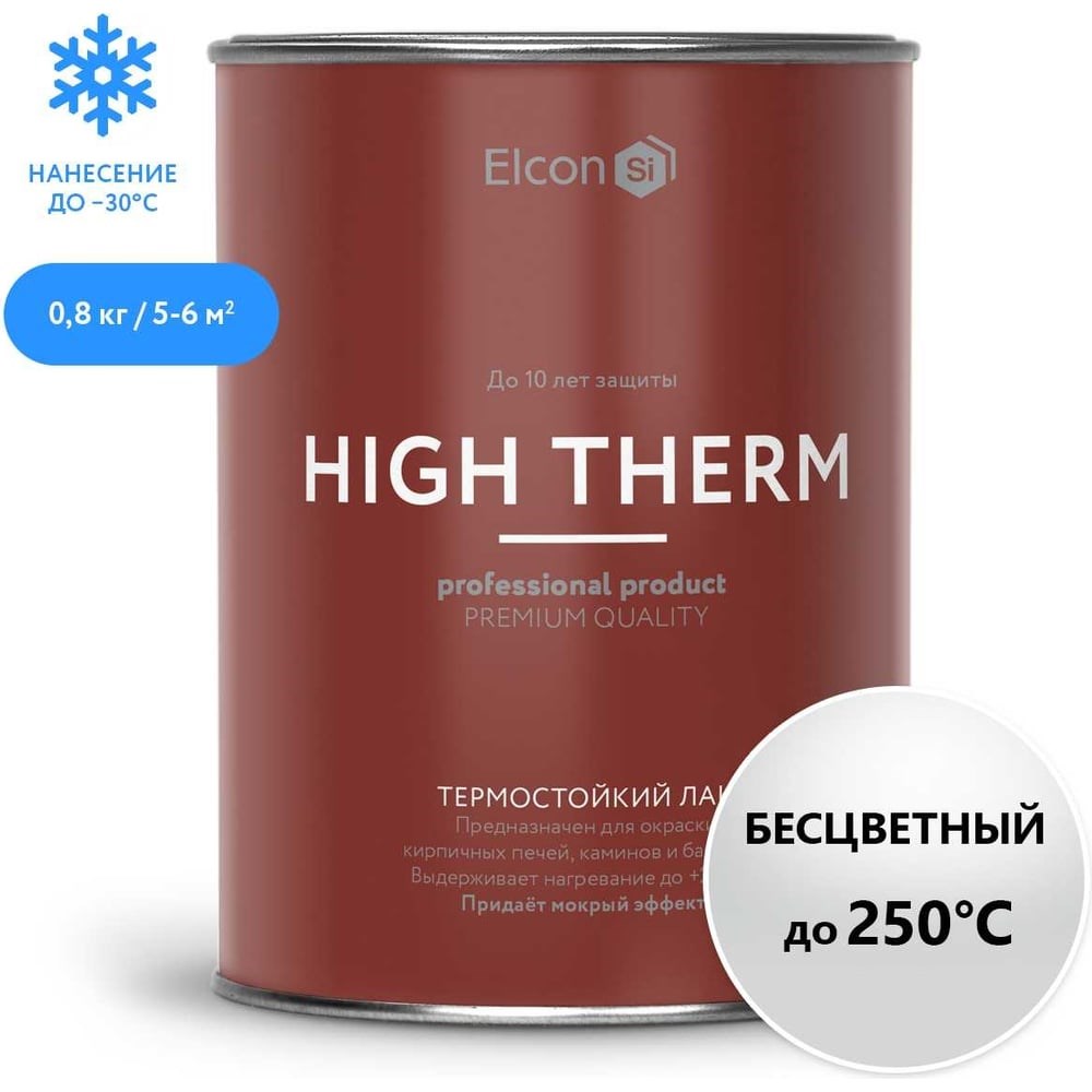 Термостойкий лак Elcon High Therm до 250С для печей, каминов, камня, кирпича, металла 1 л 00-00002950 предназначен для защитно-декоративного окрашивания кирпичных, бетонных, металлических и иных типов поверхностей, подвергающихся в процессе эксплуатации воздействию температуры до +250 °С. Лак широко используется для декоративной окраски кирпичных печей и каминов. Указания к применению:Термостойкий лак Elcon High Therm наносят на поверхность, предварительно очищенную от механических загрязнений, водорастворимых солей, жиров, масел, ржавчины.Окраску производят по сухой, обезжиренной поверхности при температуре воздуха и подложки от -30 °С до +40 °С и относительной влажности воздуха не более 80%.Термостойкий лак Elcon High Therm перед применением перемешивают и выдерживают до прекращения выделения пузырьков воздуха.При необходимости разбавления и доведения до рабочей вязкости используют растворители (Elcon R, ортоксилол).Подготовленный к нанесению лак может наноситься краскораспылителем (пневматическое или безвоздушное распыление), валиком, кистью, окунанием.Расстояние от сопла краскораспылителя до окрашиваемой поверхности должно составлять 200-300 мм в зависимости от давления воздуха и диаметра сопла.Металлические поверхности окрашивают в 2–3 перекрестных слоя с промежуточной сушкой между слоями «до отлипа» 0,5–2 часа в зависимости от температуры окружающего воздуха.При отрицательной температуре окружающего воздуха время выдержки увеличивают в 2–3 раза.