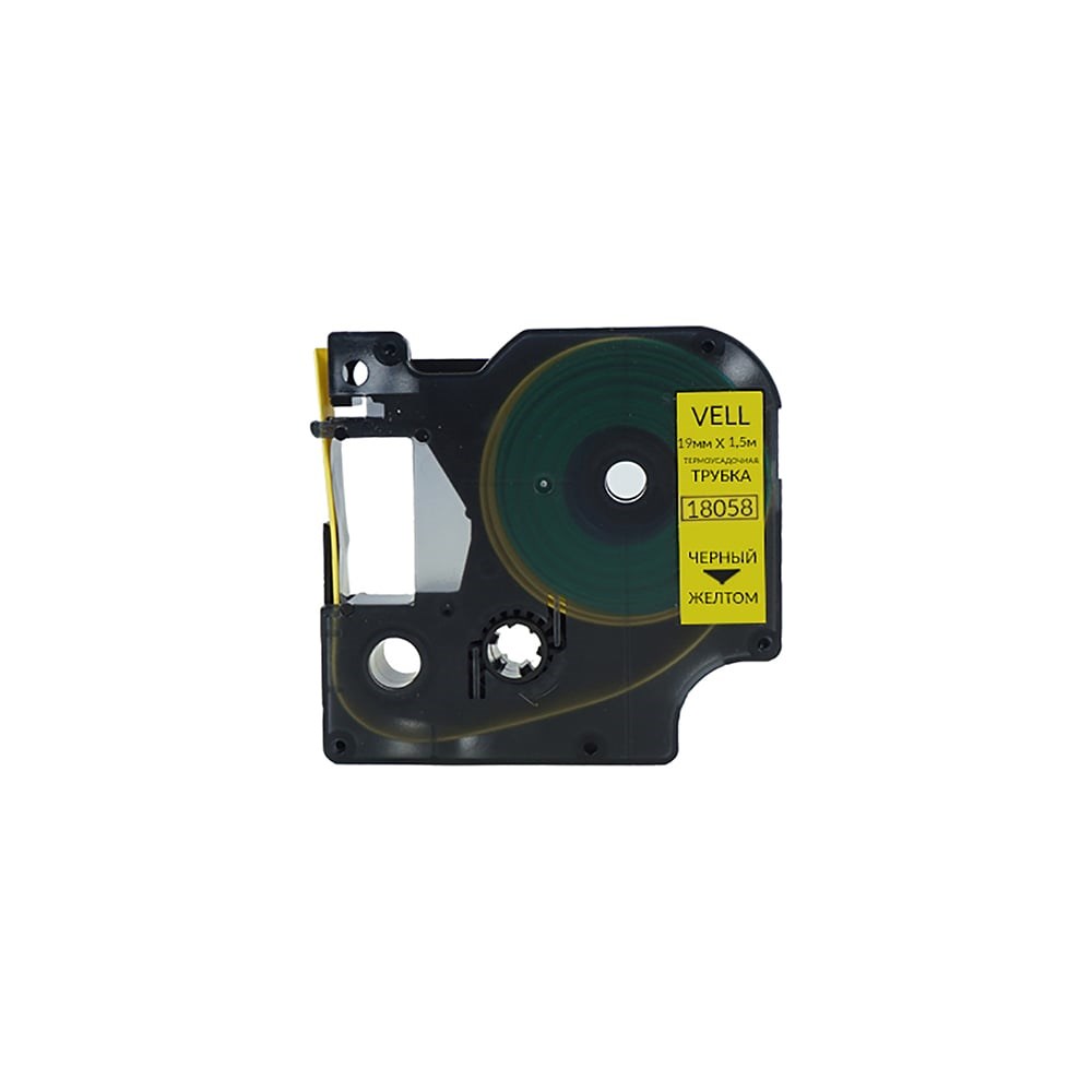 Лента Vell Vell VL-D-18058 черный текст на желтом фоне, диаметр трубки - 11 мм, длина 1.5 метра, ширина в плоском виде - 19 мм. Подходит для кабеля диаметром 4.64-8.70 мм. Термоусадочная трубка предназначена для маркировки проводов путём термоусаживания. Коэффициент термоусадки 1/2 или 1/3.Подходит для принтеров: LM 420P/500TS, Rhino 4200/5200/6000.