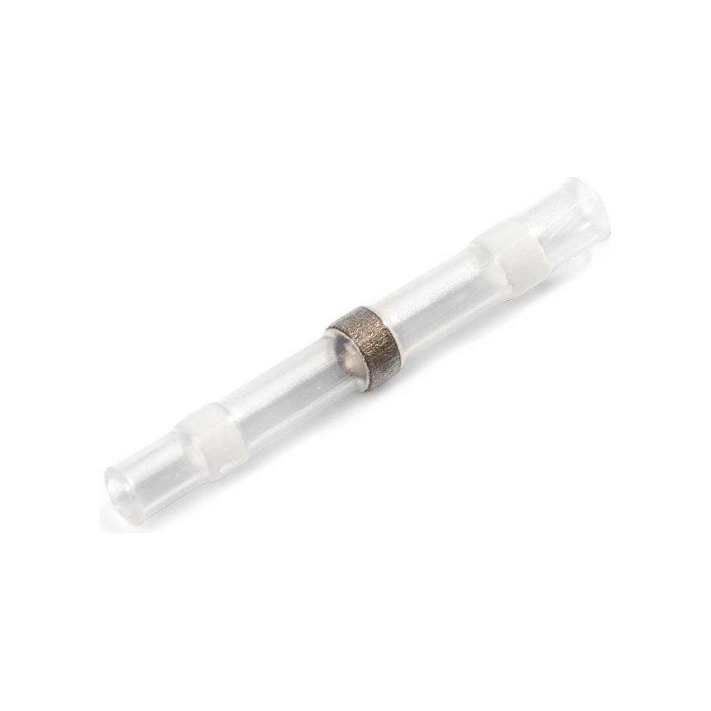 Термоусаживаемый соединитель BTI под пайку прозрачный 0,25-0,5 мм.(100шт/уп) 87 1109 00 предназначен для паяного соединения встык многопроволочных медных проводов. Не требует использования канифоли для монтажа. Особенности конструкции: В центре соединителя расположено кольцо низкотемпературного припоя. По краям соединителя на внутренней поверхности термоусаживаемой трубки интегрированы цветные пояски термоплавкого клея, обеспечивающие полную герметичность соединения после усадки. Порядок монтажа: Разместите соединитель на одном из проводов, сдвинув его в сторону от предварительно зачищенных концов жил. Распушите отдельные проводники и соедините концы жил встык таким образом, чтобы концы проводников заходили друг в друга. Обожмите руками выступающие проводники, сформировав место стыка. Сдвиньте соединитель на место контакта таким образом, чтобы поясок припоя располагался по центру соединяемых зачищенных жил. Используя бутановую горелку или высокотемпературный фен, равномерно прогрейте припой со всех сторон до его расплавления и дайте изделию остыть. Инструмент для монтажа: высокотемпературный фен.