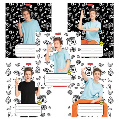 Тетрадь А5 формата 12 листов. Обложка- мелованный картон. Внутренний блок- офсет 60- 65 гр., клетка, красные поля. Скрепление- скоба.