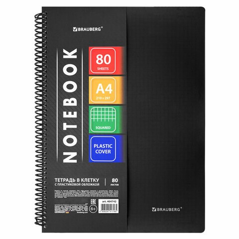 Тетрадь обложка пластик, А4, 80 л., спираль пластик, клетка, BRAUBERG "Metropolis", черный, 404742