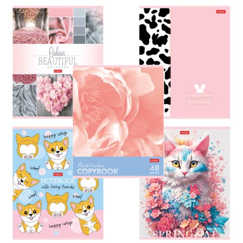 Тетрадь А5 формата 48 листов. Обложка- мелованный картон. Внутренний блок- офсет 65 гр.м, клетка, красные поля. Скрепление- скоба.
