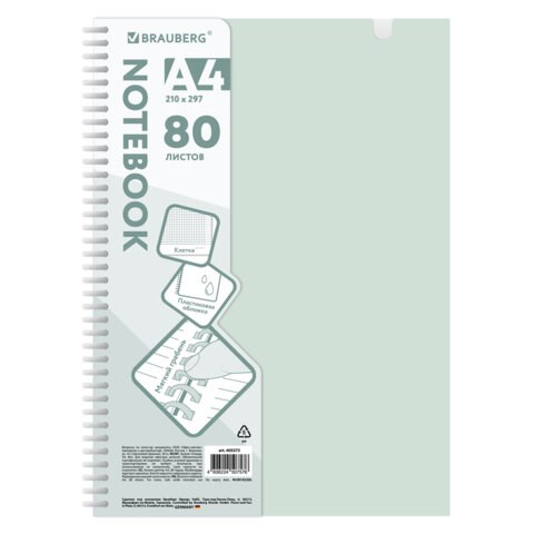 Тетрадь обложка пластик, А4 80 л., гребень мягкий, вырубка для ручки, клетка, BRAUBERG, светло-зеленый, 405373