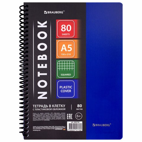 Тетрадь обложка пластик, А5, 80 л., спираль пластик, клетка, BRAUBERG "Metropolis", синий, 404744