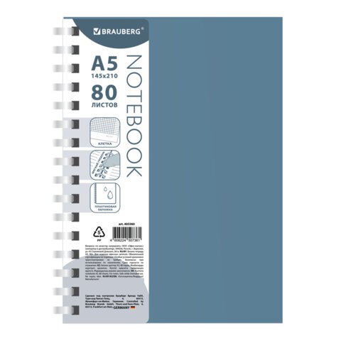 Тетрадь обложка пластик, А5 80 л., гребень мягкий (силиконовый), клетка, BRAUBERG, синий, 405360