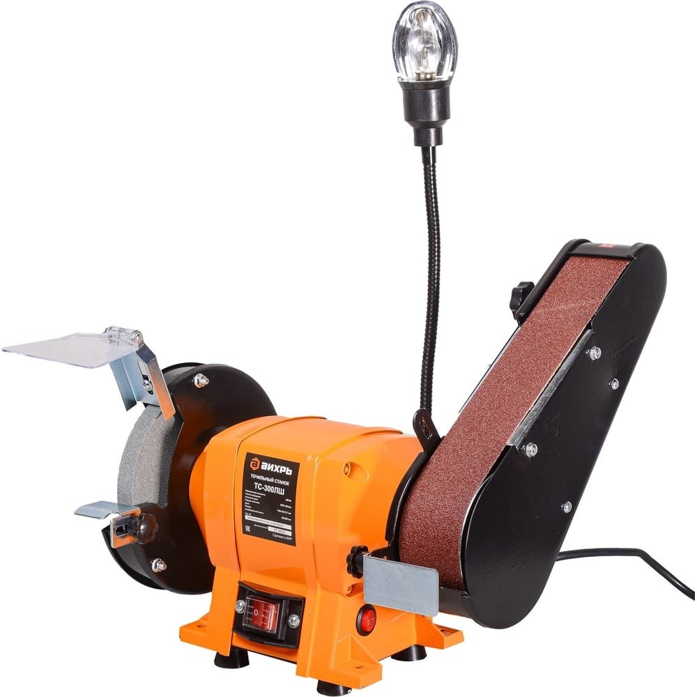 Точильный станок Вихрь ТС-300ЛШ со шлифовальной лентой используется в быту для правки и затачивания кромки инструментов для дома, мастерской, сада; обработки краев изделий из материалов различной твердости; шлифовки и полировки поверхностей. Гибкая лампа фиксируется под любым углом и подсвечивает рабочее место. В модели Вихрь ТС-300ЛШ установлен асинхронный двигатель, отличающийся низким уровнем вибраций. Для предотвращения смещения точила во время работы он крепится к верстаку через отверстия в основании станины. Электродвигатель мощностью 300 Вт через ротор приводит в движение валы с абразивным кругом и шлифовальной лентой. Они вращаются со скоростью 2950 об/мин. Круг имеет габариты 150 х 16 мм с посадочным диаметром 12,7 мм, лента – 50 х 686 мм. Точильный станок оборудован искрогасителем и защитным экраном, чтобы отражать окалину и защищать оператора от попадания искр и абразива в лицо. Рабочие упоры позволяют опереть изделия и предотвратить его соскальзывание с абразивной поверхности.