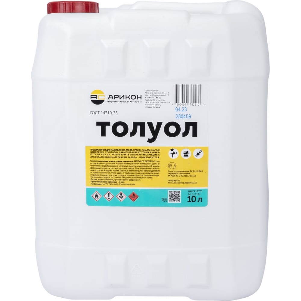 Растворитель Толуол “Арикон” канистра 10л TOL10 применяется для разбавления красок, лаков, эмалей, клеев, шпатлевок и грунтовок, имеющих маркировку НЦ и АК. Для растворения полистирола, эфиров целлюлозы, виниловых и акрилатных полимеров. Используется в различных отраслях промышленности вкачестве сырья для:органического синтеза.высокооктановых добавок к моторным топливамрастворителя.