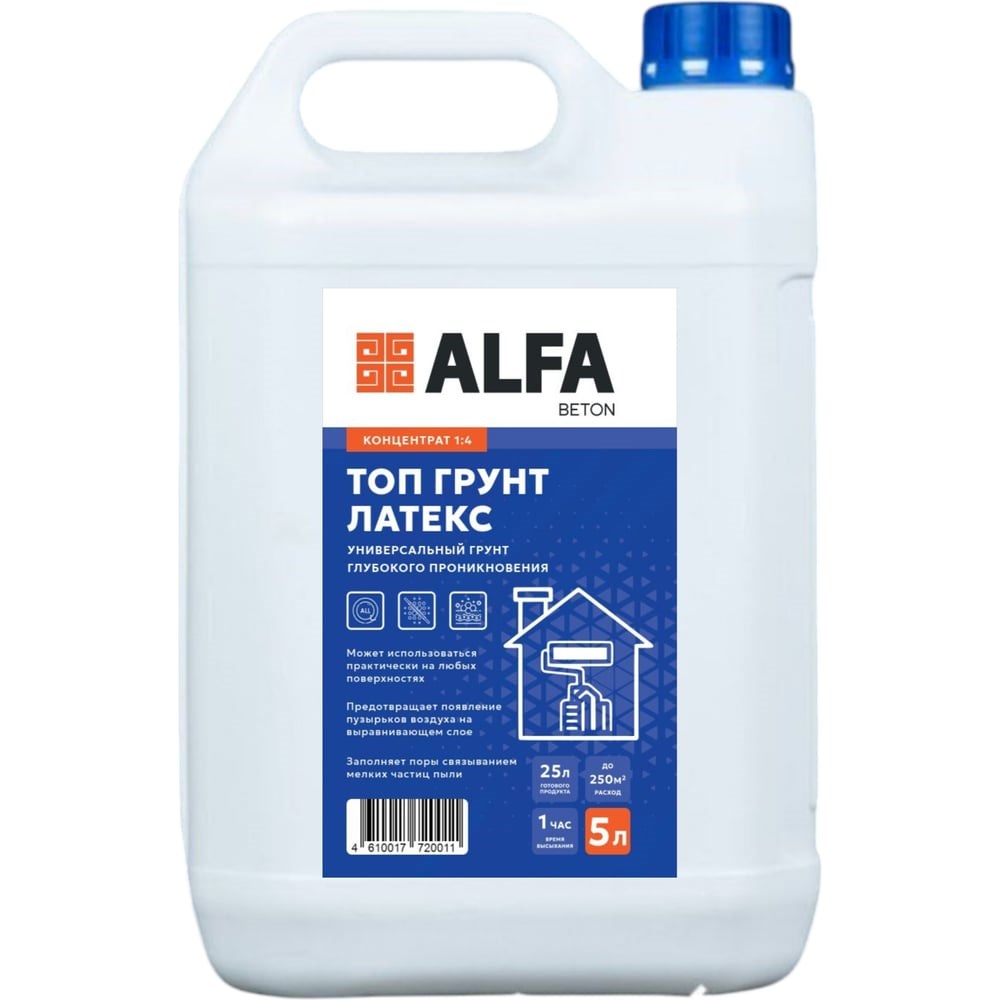 Топ Грунт AlfaBet Латекс 5 л, концентрат 20028 используется при выполнении строительных и отделочных работ. Средство способствует снижению впитывающей способности оснований. Глубоко проникает в основание, что обеспечивает прочное сцепление с отделочными материалами. Состав повышает растекаемость напольных смесей и предотвращает появление пузырьков на выравнивающем слое.