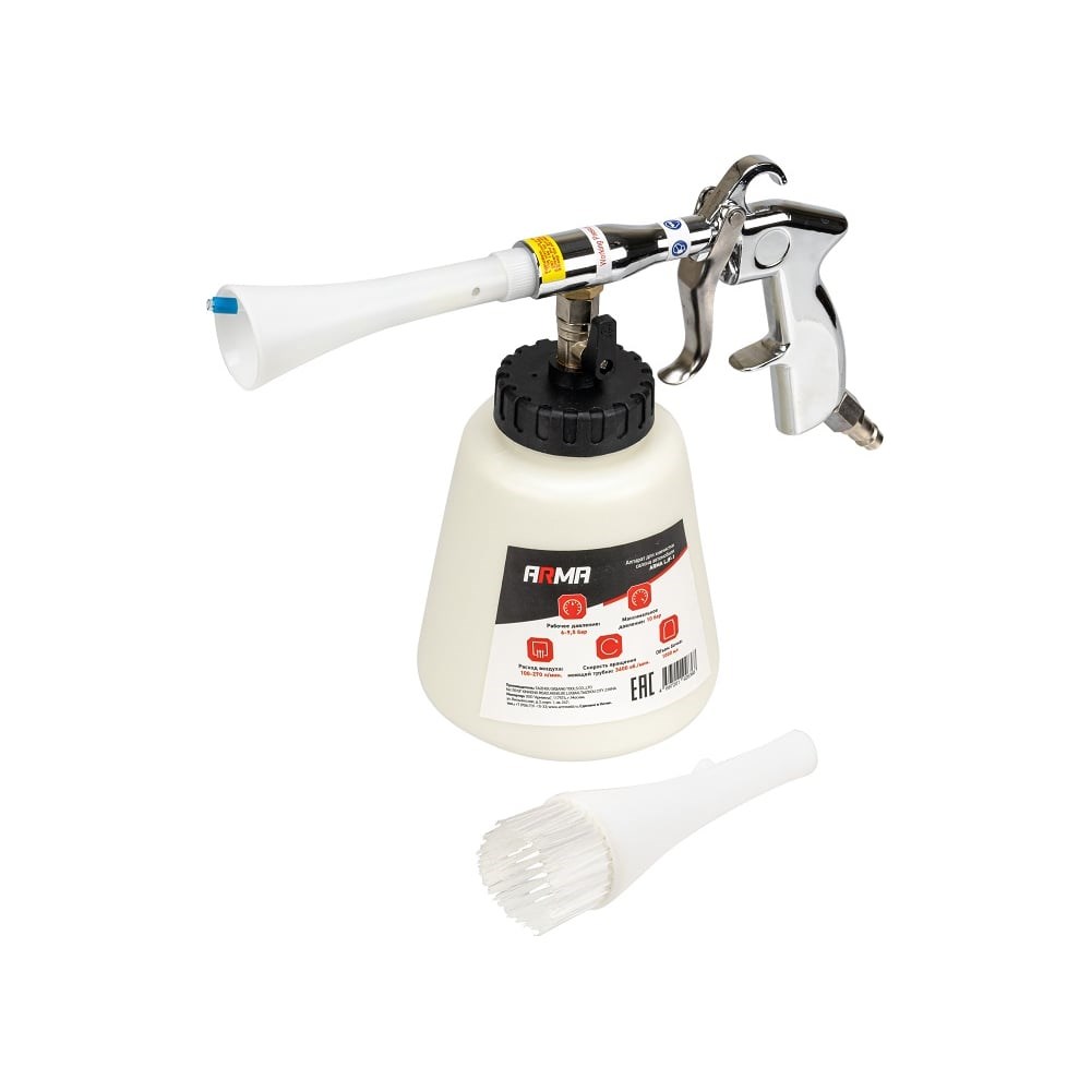 Аппарат для профессиональной чистки позволяет быстро и качественно очистить любую поверхность – металл, пластик, дерево, ткань. Благодаря мощному потоку воздуха, смешанному с химическим средством удается добиться отличного результата за считанные минуты. Расход - 100-170 л/мин Аппарат подключается к компрессору с давлением от 5 до 7,5 атмосфер. В контейнер заливается химический состав для чистки. Под давлением компрессора жидкость смешивается с воздухом, образуя вихрь с быстрыми оборотами, выдавая что-то вроде небольшого торнадо. Образовавшаяся воронка засасывает все на своем пути, грязь оседает на трубке, таким образом за считанные минуты вы получаете чистую поверхность. Аппарат превосходит по эффективности чистки все моющие пылесосы. Качество и легкость уборки с помощью этого аппарата находятся вне конкуренции. При использовании соблюдайте технику безопасности – производите чистку в хорошо проветриваемом помещении, надевайте средства защиты для глаз, и держите аппарат в недоступном для детей месте. Аппарат отличается высокой эффективностью и износостойкостью, он прекрасно работает с различными агрессивными химическими составами, может использоваться в активном режиме, поэтому подойдет как для домашнего использования, так и для небольших автомоек. Имеет обороты до 3600 об/мин.