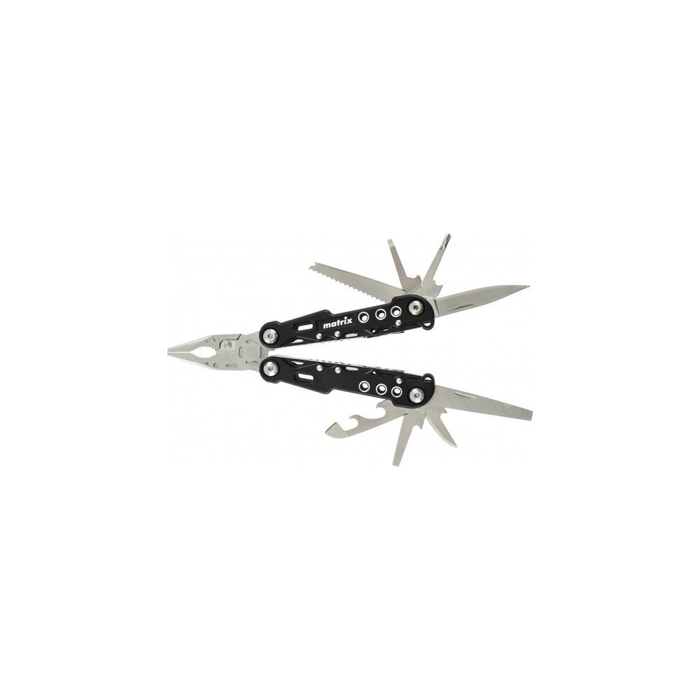 Трансформер Matrix 17622 — это мультитул длиной 165 мм с 13 функциями и авторазжимом, поставляется с чехлом. Его можно использовать в гараже — он включает длинногубцы с кусачками и захватом полукруглых предметов, а также отвертки. Инструмент пригодится в походе, на рыбалке или охоте, поскольку имеет в составе нож, пилу, открывалку и консервный нож. Благодаря пилке для ногтей мультитул будет полезен в быту.