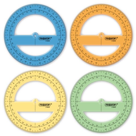 Изготовлен из прочного прозрачного пластика толщиной 1,8 мм. Шкала транспортира - 360°. Отверстие для карандаша позволяет точно находить центр и вычерчивать окружность 360°. Обладает четкой разметкой. Цвет - ассорти. Поставляется без упаковки.