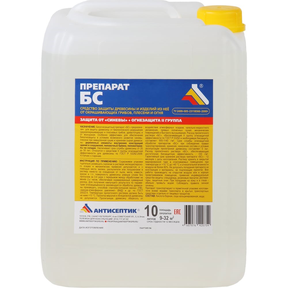Транспортная огнебиозащита ЗАО "Антисептик" БС в канистре 10 литров 00-00003434 обеспечивает защиту древесины и изделий из нее от биологического разрушения (деревоокрашивающих и плесневых грибов, древоточцев) в условиях классов службы I-VII по ГОСТ 20022.2 и от возгорания. Особенно эффективен для обеспечения биоогнезащиты в условиях возможного развития синевы, плесени при замедленной сушке и хранении сырой древесины: деревянные элементы внутренних конструкций зданий и сооружений, пиловочные бревна, пиломатериалы на складах. Гарантийный срок службы огнезащитной обработки препаратом БС от одного года и более в зависимости от поглощения (удержания) препарата древесиной и условий ее эксплуатации. Защищенная биоогнезащитным препаратом «БС» древесина приобретает стойкость к воздействию биологических агентов ее разрушения (бактерий, грибов, насекомых) и воздействию огня. Пропитка деревянных конструкций препаратом «БС» увеличивает срок службы древесины от 20 до 50 лет в зависимости от поглощения (удержания) препарата древесиной и условий ее эксплуатации. Препарат «БС» относится к средствам II группы огнезащитной эффективности для древесины по ГОСТ Р 53292-2009. Устойчив к старению.