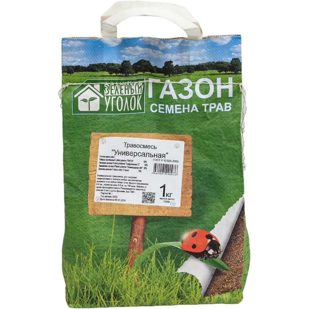 Семена газона Зеленый уголок Универсальная, 1 кг 4660001290976 - универсальная травосмесь для создания неприхотливого газона в любых экологических условиях и на любых типах почв. Высота скашивания 6-8 см.