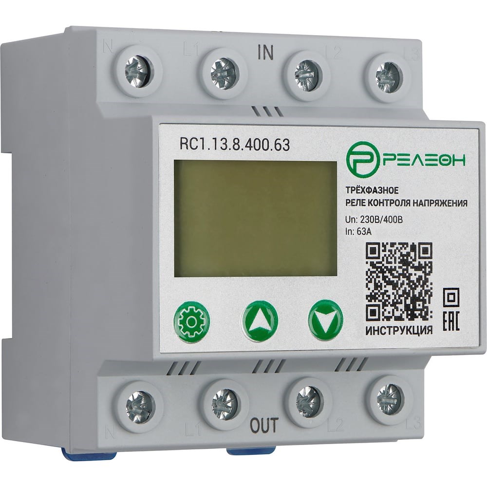 Трехфазное реле контроля напряжения РЕЛЕОН 230-400В AC; 63А, RC113840063 контролирует следующие параметры:Повышенное напряжениеПониженное напряжениеОбрыв фазыЧередование фазАсимметрия фазОбрыв нейтралиПамять сбоев