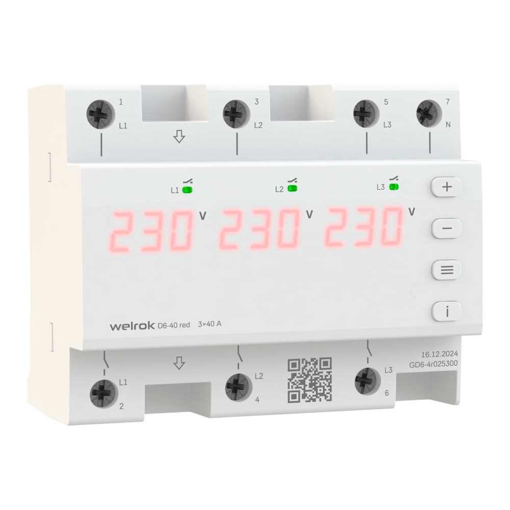 Реле напряжения Welrok D6 защищает электрооборудование от критических скачков напряжения в сети, занимает 6 модулей и может работать в режиме однофазной или трехфазной нагрузки. Два режима работы в одном корпусе Режим однофазной нагрузки (асинхронный) применяется для защиты однофазного оборудования от скачков напряжения индивидуально по каждой фазе. В случае аварии на какой-либо из фаз, реле отключит только аварийную фазу. Режим трехфазной нагрузки (синхронный) применяется для защиты трехфазного оборудования от скачков напряжения, контролирует перекос, порядок чередования и обрыв фаз. В случае аварии на какой-либо из фаз, реле отключит все фазы. Максимальная функциональность Точные измерения с алгоритмом TrueRMS Скорость срабатывания реле не более 0,03 сек. Для уменьшения количества срабатываний: Защита от частых срабатываний при выходе напряжения за пределы Регулируемый гистерезис Регулируемая задержка включения нагрузки (2 типа) Профессиональная модель отключения при выходе напряжения за пределы Задержка отключения при провале напряжения