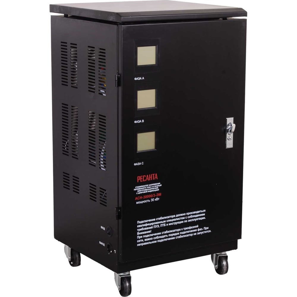 Стабилизатор напряжения Ресанта АСН-30000/3-ЭМ – мощное и эффективное устройство, позволяющее обеспечить стабильным постоянным током не только загородный дом, но и офисное помещение, а также небольшую производственную линию. Его использование позволит обезопасить дорогостоящую бытовую технику и оборудование от поломки из-за перепадов напряжения.Отличительные особенности стабилизатора напряжения Ресанта АСН-30000/3-ЭМ:Мощность устройства составляет внушительные 30 кВт. При выборе важно брать устройство с запасом мощности примерно в 20% от необходимой.Номинальная величина выходного напряжения составит 380 В.Погрешность выходного напряжения всего 2%. Особенно этот показатель важен при использовании высокоточного оборудования.На передней части корпуса расположено три LCD-дисплея, на которых отражается вся необходимая информация о работе устройства.Диапазон входного напряжения может варьироваться от 140 до 260 В, а линейное – 240-430 В.Устройство имеет класс защиты IP20. Корпус не герметизирован. Кроме этого, диапазон рабочих температур от -5 до +40 ℃. Поэтому стабилизатор необходимо использовать только в помещении.Внушительная масса в 86 кг компенсируется колесами, расположенными в нижней части корпуса.Стабилизатор напряжения Ресанта АСН-30000/3-ЭМ предназначен для выравнивания напряжения, поступающего из внешней сети. Он поможет нивелировать перепады в подаче электричества и предохранить оборудование, а также бытовую технику от поломки.