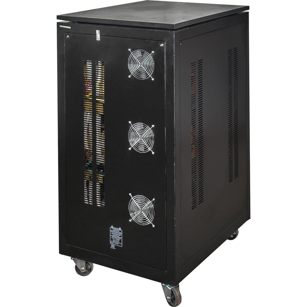 Стабилизатор напряжения Ресанта АСН-80000/3-ЭМ используется для трехфазной сети. Обеспечивает номинальную величину напряжения на выходе 380 В при входных значениях 240-430 В. Погрешность составляет не более 2%. Прибор способен защитить электрические приборы совокупной мощностью до 80000 Вт от скачков напряжения и сетевых помех. Каждая фаза имеет отдельный вольтметр, показатели которого отображаются на дисплее панели управления. В сочетании с цифровой индикацией они позволяют контролировать рабочий процесс. Скорость регулирования напряжения составляет 40 в/с. Превышение пределов поддерживаемого входного напряжения автоматически отключает подачу питания, продлевая срок эксплуатации устройства. Диапазон рабочих температур от -5 до +40° C обеспечивает широкие возможности использования прибора.Стабилизатор напряжения электромеханического типа Ресанта АСН-80000/3-ЭМ используется для обеспечения стабильного электропитания в частных домах, офисных зданиях, на производственных, строительных и торговых площадках. Отличается низким уровнем шума во время работы. Надежный металлический корпус защищает внутреннюю автоматику от механических повреждений. Продуманная система доступа к основным элементам агрегата обеспечивает удобство технического обслуживания. Вентиляционные отверстия на корпусе созданы для естественной вентиляции и препятствуют перегреву деталей. Колеса в нижней части конструкции позволяют при необходимости легко перемещать стабилизатор.