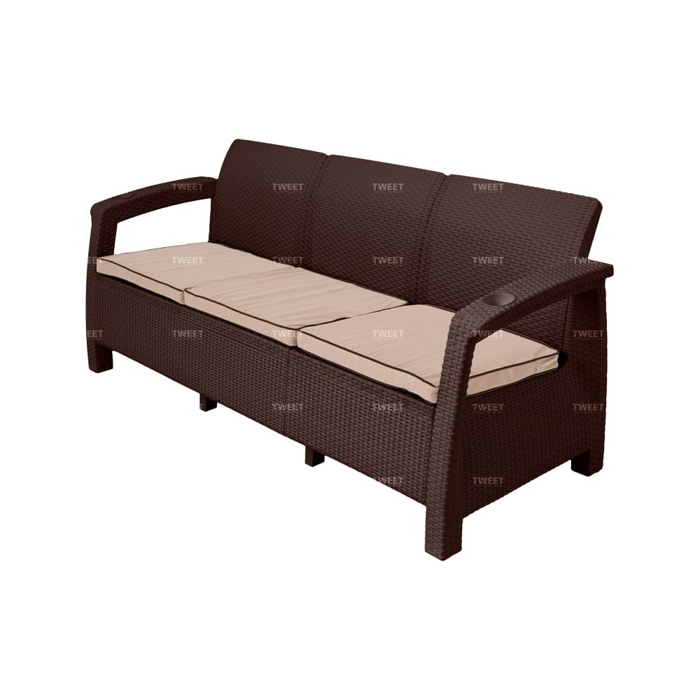 Пластиковый 3х-местный диван TWEET от российского производителя Gardeck идеально подойдёт для оформления садового участка, позволяет с комфортом разместиться Вам и Вашим гостям на террасе или балконе.Диванвыполненв стильном дизайне с имитацией плетения под искусственный ротанг. В отличие от плетеной мебели, имитация ротанга не расплетается и не вытягивается, надолго сохраняя привлекательный внешний вид.Удобная конструкция поддерживает спину, мягкие подушки со съемными чехлами на молнии толщиной 50мм из холофайбера (не впитывает влагу) из ткани Oxford дают дополнительный комфорт. Широкие подлокотники с двумя глубокими подстаканниками для напитков.Мебель выдерживает высокую нагрузку на сидячее место до 120 кг. Высокий срок службы - более 25 лет.Мебель TWEET - этоРоссийский проект импортозамещения мебели известных европейских марок.Высокие стандарты качества производства и состава продукции.Беспрерывное производство и стабильные сроки поставки продукции.Низкая цена, не зависящая от колебаний курсов валют по сравнению с импортными аналогами.