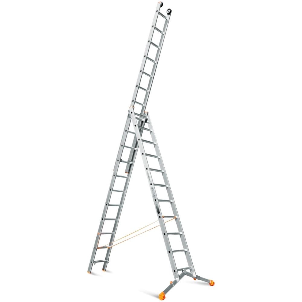 Трехсекционная лестница Эйфель ТЛ 3х11 Ювелир Плюс предназначена для бытового и профессионального использования. Состоит из стремянки и приставной части, на которой расположены колеса. Лестница выполнена из легкого и прочного материала - алюминия. Угловая траверса гарантирует устойчивость лестницы и безопасность при работе. Опоры из композитного материала служат для устранения скольжения по полу.
