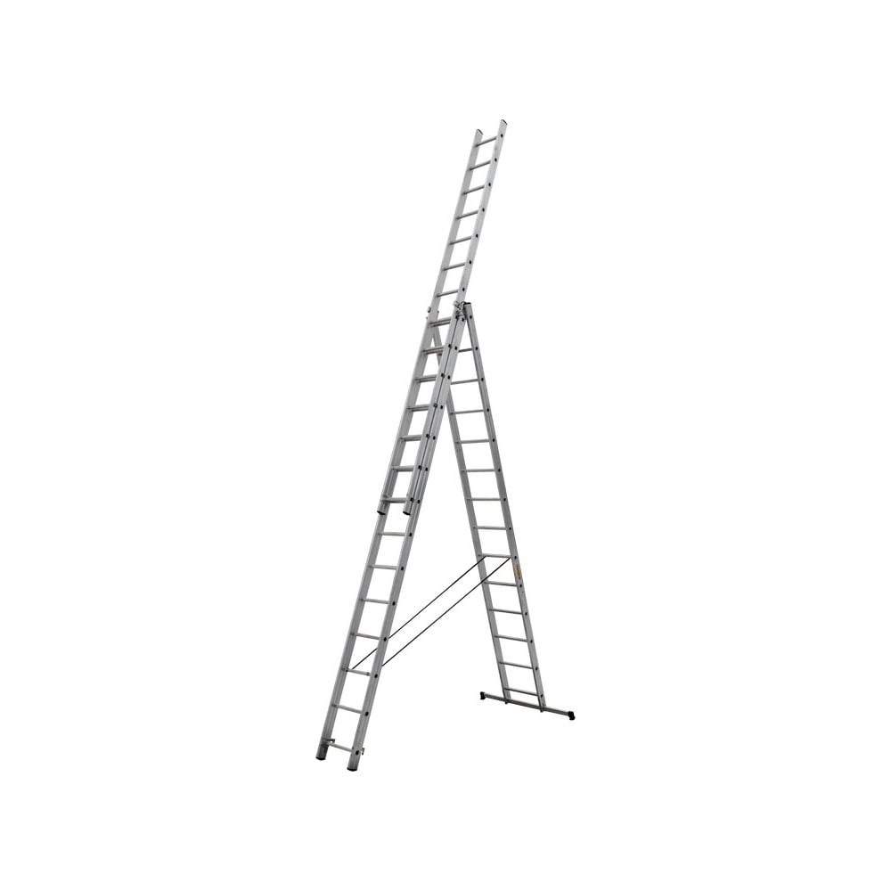 Алюминиевая трехсекционная лестница обладает множеством преимуществ, включая долговечность и многофункциональность. Лестница изготавливается из специального сплава алюминия, который обеспечивает повышенную стойкость к коррозии и к повреждениям механического характера. При изготовлении лестниц используется несущий профиль двух типов, каждый из которых соответствует нагрузке на секцию. Повышенная прочность, проверенная многочисленными испытаниями; Небольшой вес – конструкцию легко переносить с одного места на другое; Мобильность – складные лестницы не создают проблем с хранением и транспортировкой; Простая установка лестницы в правильное и безопасное положение. Трехсекционная лестница может использоваться как: Стремянка, Приставная лестница, Лестница-стремянка. В конструкции лестниц используются: секционные алюминиевые стопорные крюки с замком безопасности; нескользящие рифленые ступени; широкий стабилизатор с большими опорами, обеспечивающий устойчивость; ременные стяжки безопасности. Рекомендованная максимальная рабочая нагрузка - 120 килограмм. Внимание! Количество ступеней отличается от представленного на фото.