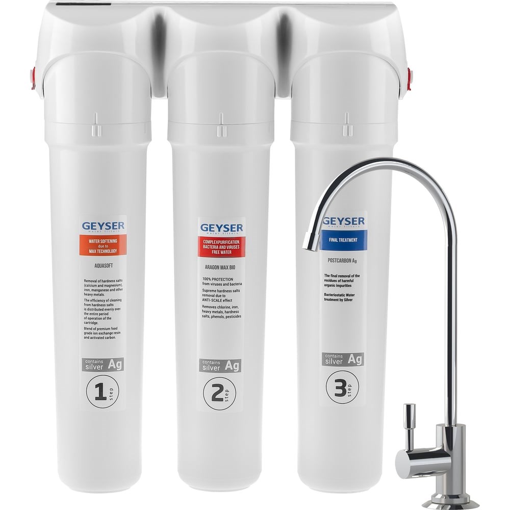 Трёхступенчатый фильтр Гейзер Смарт Макс Био 16031 предназначен для комплексной очистки воды до питьевого уровня. Благодаря уникальной комбинации сменных элементов обладает большим ресурсом по умягчению - защита от накипи до 6-и раза дольше, чем у обычных трёхступенчатых систем. Но при этом фильтр сохраняет минеральный состав воды.Гейзер Смарт Макс Био так же очищает воду от:хлора и хлорорганики, устраняя неприятный запах и улучшая вкус воды;железа, тяжёлых металлов, бактерий и вирусов - делая воду безопасной для употребления без кипячения.Вода в фильтре Смарт Макс Био проходит 3 ступени очистки:1. АкваСофт Смарт - смесь ионообменных смол пищевого класса АкваСофт с повышенной емкостью для удаления избыточных солей жесткости (накипи), железа и марганца;2. Арагон Смарт Макс Био — уникальный картридж, разработанный для очистки жесткой воды. Благодаря наличию в составе специальной ионообменной смолы и сбалансированной структуре материала Арагон Макс Био обеспечивается бесперебойная и качественная работа картриджа на протяжении всего ресурса. Картридж удаляет из воды 100% бактерий и вирусов. Активное серебро в его составе предотвращает жизнедеятельность бактерий;3. Посткарбон Ag Смарт содержит высококачественный кокосовый уголь и материал Каталон, для удаления из воды хлора и хлорорганических примесей, доочистки от железа и тяжелых металлов, улучшения вкуса и цвета воды. Серебро в безопасной форме блокирует размножение бактерий.Гарантия на фильтр 2 года, срок службы 5 лет.