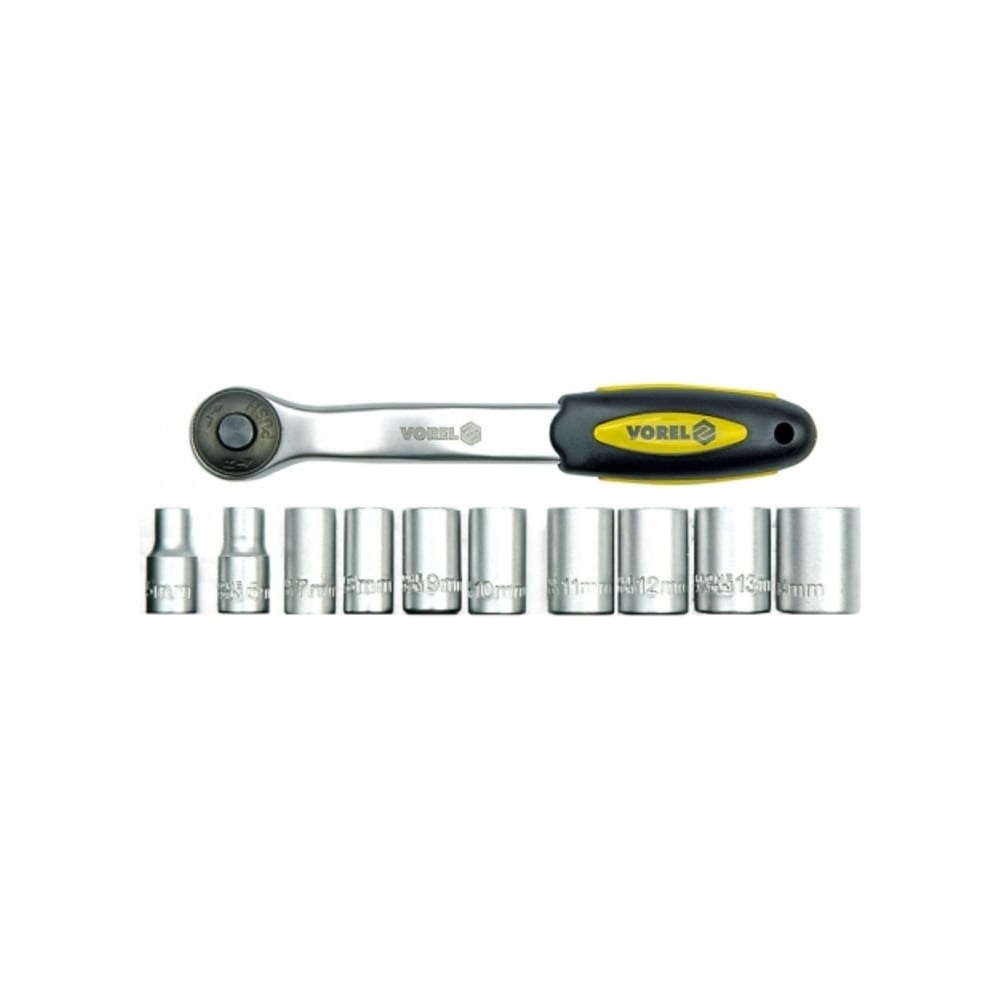 Трещотка с насадками VOREL 1/4", CRV, 11 предметов 58600 предназначен для профессиональных работ в автомастерских и для индивидуального применения. Торцевые головки используются с внешними рабочими профилями и выдерживают интенсивные нагрузки, а также обеспечивают высокое качество выполняемых работ. Применяются при сборе и разборе резьбовых соединений, испытывающих значительные нагрузки. Инструмент изготовлен из высококачественной хромованадиевой стали, что обеспечивает прочность, стойкость к износу и долгий срок службы. Головки поставляются в комплекте с ключом, оснащенным храповым механизмом.