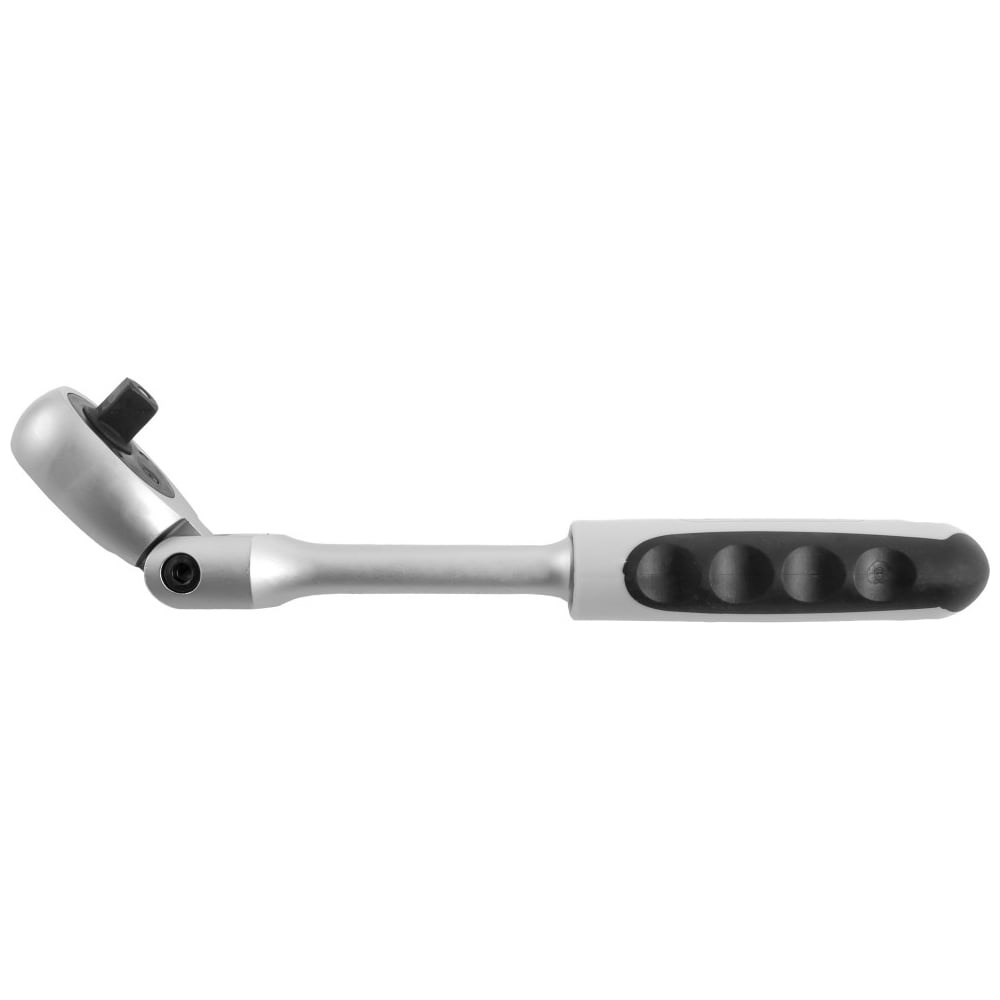 Рукоятка трещоточная с шарниром 3/8"DR, 72 зубцов, 240 мм. Трещоточная рукоятка с флажковым переключателем и композитной, оригинальной двухкомпонентной бензомаслостойкой рукояткой, обеспечивающей надежный захват инструмента при работе. Изделие соответствует требованиям ГОСТ 22402-77. Храповое колесо в 72 зубца, обеспечивающее 5° свободного хода и увеличенное пятно контакта храпового механизма, гарантирует большой запас прочности при высоком крутящем моменте. Устройство быстрого сброса обеспечивает легкую смену и надежно фиксирует насадку на приводе. Имеет шарнир с сегментированной фиксацией.