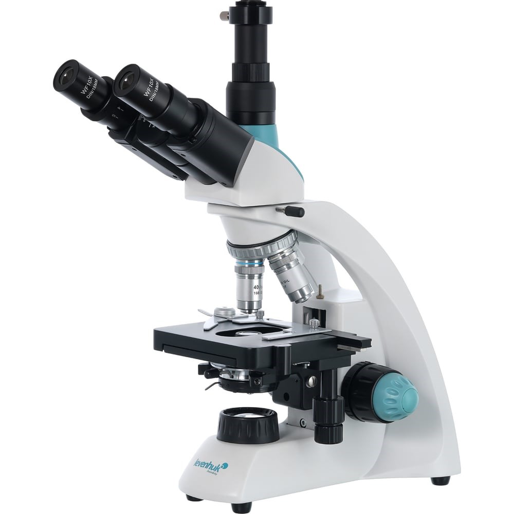 Тринокулярный микроскоп Levenhuk 500T 75426 предназначен для лабораторных исследований разной степени сложности. В нем используются ахроматическая оптика и галогенная подсветка, что позволяет детально и наиболее полно изучать окрашенные микропрепараты. Микроскоп найдет свое применение и в научно-исследовательском институте, и в ветеринарной лаборатории, и в медицинской клинике. Модель также подходит для оснащения кафедр высших учебных заведений и колледжей. Насадка состоит из бинокулярного визуального блока (он имеет небольшой наклон в 30°) и отдельно расположенной вертикальной трубки (в нее можно установить цифровую камеру). Насадка вращается, что делает работу в лаборатории более удобной. Окуляры широкопольные и дают увеличение в 10 крат. Ахроматические объективы уже установлены в револьверное устройство. 40-кратный и 100-кратный объективы имеют защиту передней линзы – специальную пружинящую оправу. 100-кратный объектив используется для масляной иммерсии. Оптическая схема микроскопа позволяет проводить исследования на увеличении от 40 до 1000 крат. Для настройки резкости применяется коаксиальный механизм грубой и точной фокусировки. Предметный столик снабжен препаратоводителем. Прямо под столиком находится регулируемый по высоте конденсор Аббе с ирисовой диафрагмой. Для установки светофильтра предусмотрен специальный держатель. Подсветка – это галогенная лампочка и коллектор, она работает от сети переменного тока. Яркость подсветки можно регулировать.