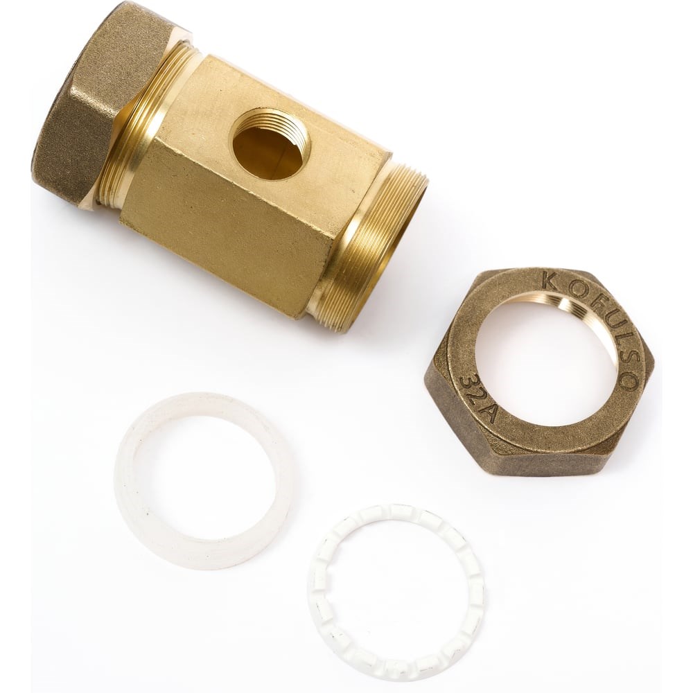 Тройник "труба-внутр. резьба-труба" BNI32*15 - 1 шт.Тройник "труба-внутр. резьба-труба" BNI32*15 предназначен для надежного соединения гофрированных труб из нержавеющей стали диаметром 32 мм и выходом на наружную резьбу ½ дюйма . Тройники KOFULSO для гофрированных труб сделаны из сплава латуни ЛС59-1, выдерживают давление до 16 бар и используются в системах водоснабжения, пожаротушения, климатического и компрессорного оборудования.