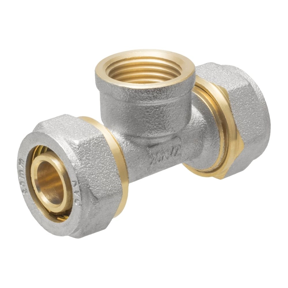 Тройник 20х1/2"х20 ц/г/ц Rvc RC 00712 предназначен для создания разъемного обжимного соединения трубопроводов из металлополимерных труб в системах питьевого и хозяйственного водопровода, горячего водоснабжения, отопления, а также на технологических трубопроводах, транспортирующих жидкости, не агрессивные к материалам труб и соединителей. Материал прокладки: синтетический каучук EPDM Материал прокладки диэлектрической: фторопласт PTFE Рабочая температура: от -20°C до +90°C Номинальное давление: 10 Bar