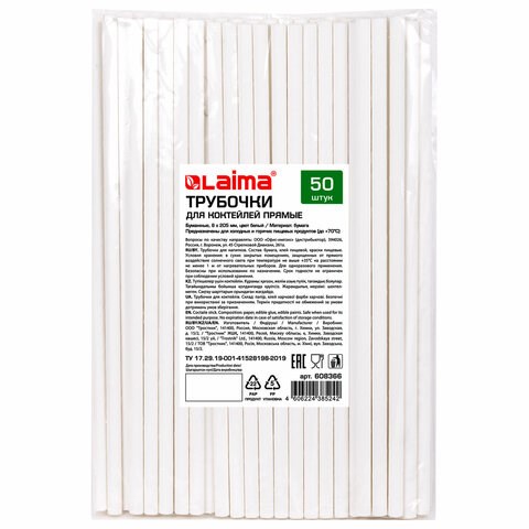 Трубочки для коктейлей бумажные, прямые, 6х205 мм, белые, комплект 50 штук, LAIMA, 608366