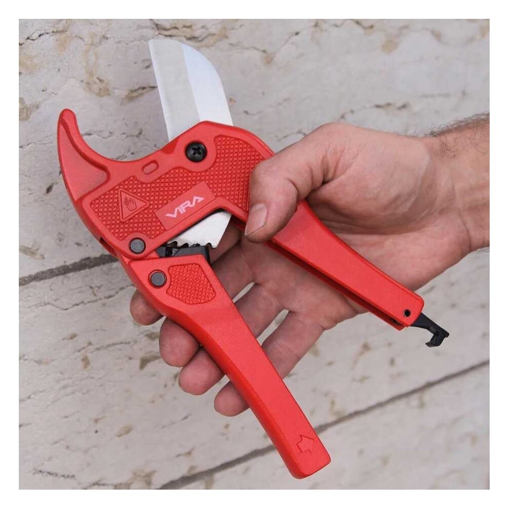 Ножницы для пластиковых и металлопластиковых труб до 42 мм с пружиной VIRAНожницы предназначены для резки пластиковых и металлопластиковых труб. Инструмент оснащен храповым механизмом и автоматическим отводом рукоятки, который позволяет снизить усилие при резке и увеличить производительность труда. Благодаря ножницам, значительно снижается время работы и получается аккуратный, строго перпендикулярный рез необходимый для качественного и герметичного соединения труб. Корпус изготовлен из дюралюминиевого сплава, лезвие из нержавеющей стали 3CR13Характеристики:Материал лезвия: нержавеющая сталь 3CR13Материал ножниц: дюралюминийВес ножниц (г): 238Диаметр труб (мм): до 42Совместимость с трубами: PEX, PP, PE, PU, PEX-AL-PEX, VPE, CPVC, PVC, PVDFПрименение: для резки пластиковых и металлопластиковых трубОсобенность: храповый механизм, автоматический отвод рукоятки