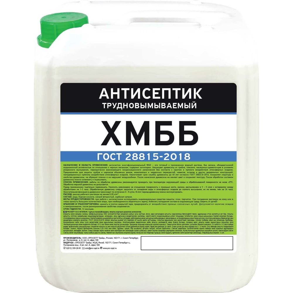 Антисептик PROSEPT ХМББ трудновымываемый ГОСТ 10 л 067-10 - готовый к применению водный раствор для консервации древесины, без запаха, незначительно корродирует черные металлы, содержит огнезащитные компоненты, образует двойную защиту. Предназначен для защиты древесины и деревянных строительных конструкций (обрешетка кровли, стропильная система, срубы, межэтажные и чердачные перекрытия, свесы, карнизы, каркасы обшивных домов) от биологического разрушения (гниения, поражения древоточцами), особенно эффективен в условиях умеренного вымывания, периодического промерзания или контакта с периодически увлажняемыми материалами. Состав увеличивает срок службы до 40 лет в зависимости от поглощения (удержания) препарата древесиной и условий ее эксплуатации. После нанесения деревянная поверхность приобретает зеленоватый оттенок. Способ применения: Работы по обработке древесины рекомендуется проводить при температуре окружающей среды и обрабатываемой поверхности не ниже +5°С. Перед использованием тщательно перемешать. Наносить равномерно на очищенную поверхность с помощью кисти, валика, распылением, погружением в раствор, вымачиванием или пропиткой под давлением. Обработанную древесину следует защитить от попадания воды и атмосферных осадков до полного высыхания, но не менее, чем на 24 часа. Окончательная фиксация происходит по истечении 3 - 5 суток. Расход рабочего раствора 0,5 л/м²