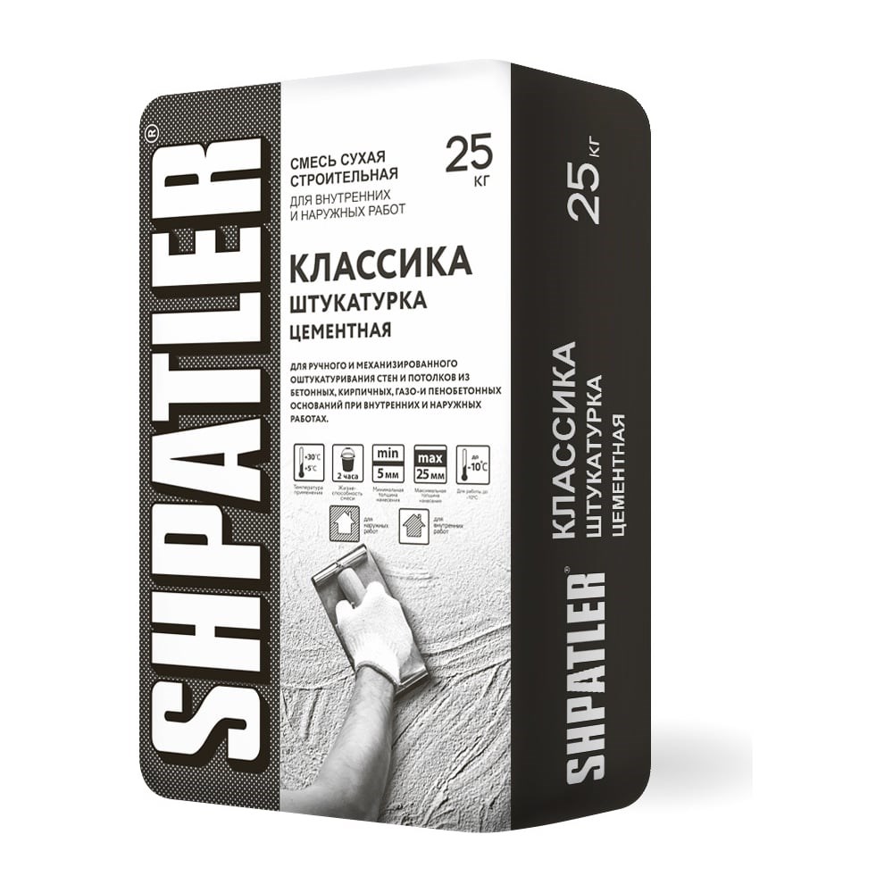 Цементная штукатурка ШПАТЛЕР Классика 25 кг Ш00013 - сухая смесь предназначена для ручного и механизированного оштукатуривания стен и потолков из бетонных, кирпичных, газо- и пенобетонных оснований при внутренних и наружных работах. Допускается проведение работ при температуре до -10°С упаковка с маркировкой «снежинка». Описание продукта: Сухая смесь на основе цемента, состоящая из мелкозернистого заполнителя и модифицированная минеральными добавками. При смешивании с водой образует растворную смесь, удобную для нанесения и последующего заглаживания. После затвердевания образует морозостойкий и водостойкий раствор. Рекомендуется как для машинного, так и для ручного нанесения. ТЕХНИЧЕСКИЕ ХАРАКТЕРИСТИКИ* Температура применения +(5-30)°С Расход сухой смеси на 10 мм слоя 12-14 кг/м2 Расход воды при ручном нанесении 0,18-0,22 л/кг Наибольшая крупность зёрен заполнителя 0,63 мм Подвижность растворной смеси Пк3 Минимальная толщина слоя: -по бетону, железобетону 3 мм -по кирпичу 5 мм Максимальная толщина слоя: -по бетону, железобетону 15 мм -по кирпичу 25 мм Время использования готовой растворной смеси не менее 2 ч Марочная прочность М25 Марка по морозостойкости F35 Удельная эффективная активность естественных радионуклидов Аэфф не более 370 Бк/кг