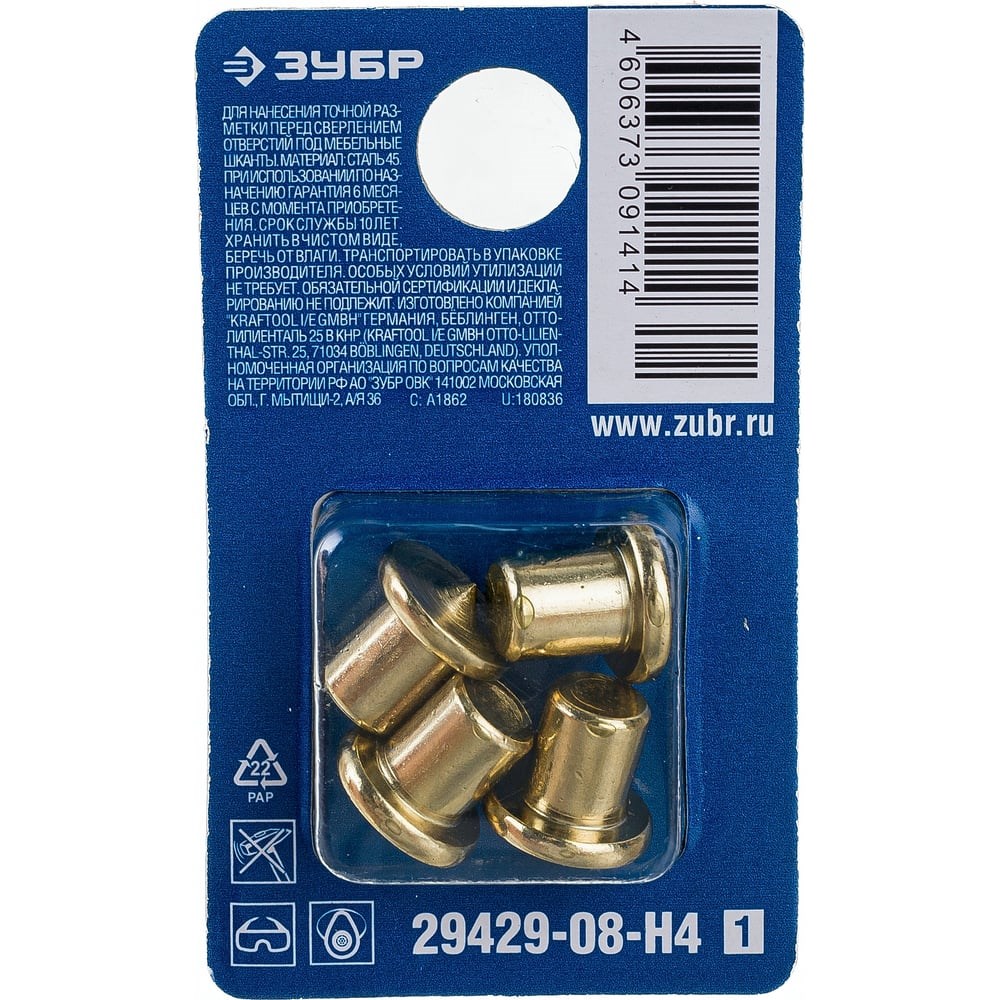 Центровка-кернер по дереву, в наборе 4 шт Зубр Профессионал, d=8мм 29429-08-H4_z01 используется для разметочных работ при подготовке к сверлению отверстий. Также применяется при монтаже мебельных шкантов. Изделие выполнено из стали и имеет большой рабочий ресурс. Медное покрытие надежно защищает инструмент от коррозии.