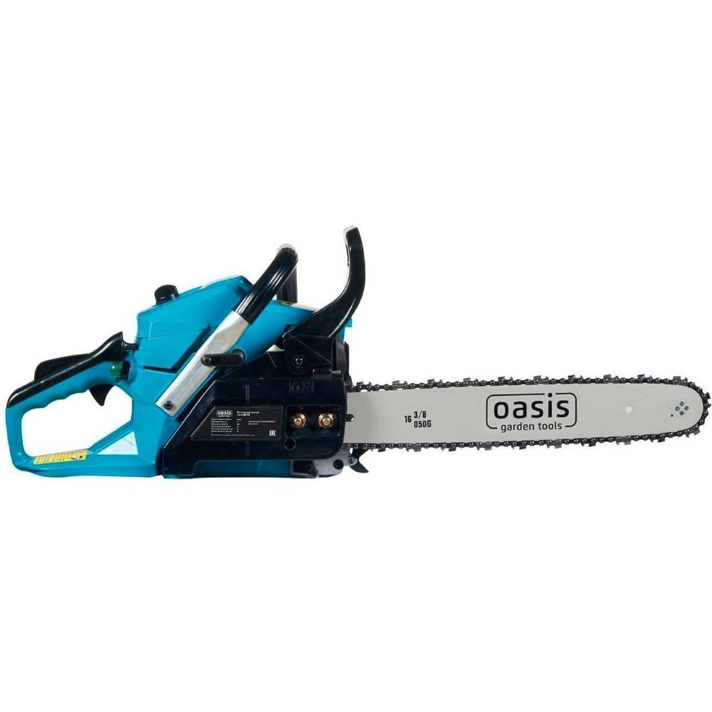 Цепная бензиновая пила Oasis GS-16 – это хозяйственный прибор, который используется при работе с древесиной и другими материалами. Инструмент позволяет спилить лишние сухие ветки, распилить брёвна для обогрева дома и подготовить доски для дальнейшего ремонта или строительства. Удобство использования. Бензиновая пила оснащена надёжным бензиновым двухтактным двигателем мощностью 2,5 л.с. Топливный бак объёмом 310 мл позволяет работать в течение долгого времени без перерыва. Ручной топливный насос облегчает запуск холодного двигателя или запуск после длительного перерыва в работе. Боковое расположение механизма натяжения цепи делает процесс натяжения легкодоступным, удобным и быстрым. Бензиновая пила имеет регулируемую автоматическую систему смазки пильной цепи, что обеспечивает постоянную и бесперебойную работу цепного механизма. Практичность и безопасность. Для безопасного и комфортного использования бензопила оснащена блокировкой дросселя газа, предотвращающим случайное включение. Благодаря тормозу цепи диск моментально останавливается в случае возникновения толчка отдачи. Передовая система антивибрации значительно уменьшает вибрацию при работе двигателя, что делает работу более комфортной. Цепная пила Oasis имеет эргономичные рукоятки, которые обеспечивают надёжный и комфортный хват. Цепные бензиновые бензопилы Oasis – ваш надёжный помощник в работе с деревом.