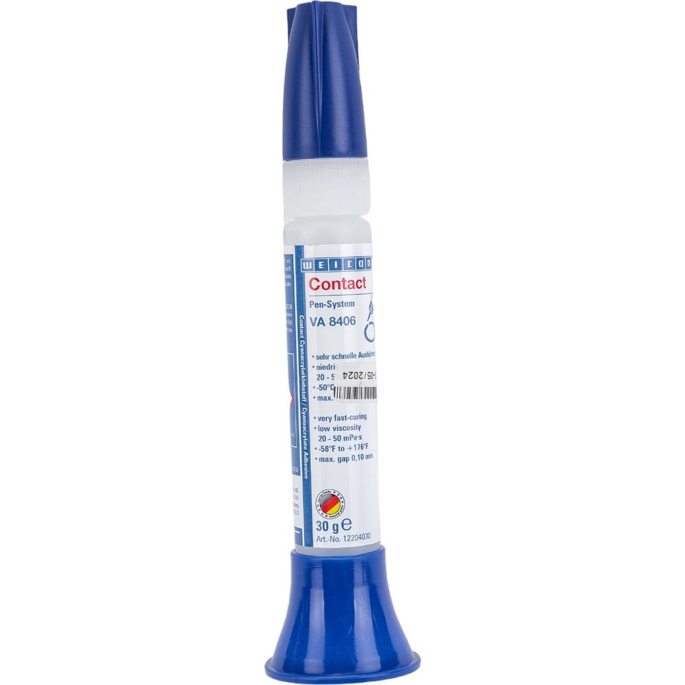 Цианоакрилатный клей WEICON Contact VA 8406 (основа - этилат) 30 г wcn12204030 рекомендуется для фиксации пористой или сплошной резины, склеивания деталей из пластмассы, эластомеров из этилпропиленового каучука. Клей имеет очень высокую степень полимеризации. При совместном использовании со специальным праймером склеивает тефлон и силикон. Выдерживает температуру от -50 до +135 °С. Устойчив к воздействию многих химических реагентов. Масса вещества - 30 г.