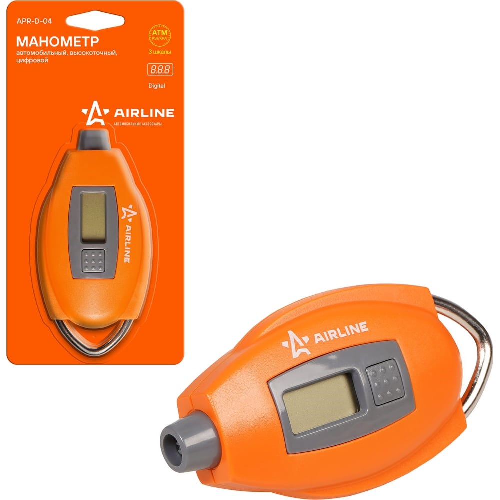 Цифровой манометр Airline 7 АТМ APR-D-04 служит для измерения давления в шинах автомобиля. Манометр имеет лёгкий пластиковый корпус. Металлическое полукольцо на корпусе позволяет закрепить манометр на связке ключей. Жидкокристаллический дисплей отображает измеренные показания в трёх единицах измерения. Выбрать нужные единицы измерения можно во время работы, путём нажатия на кнопку. Подсветка дисплея позволит проводить измерения даже в тёмное время суток. Функция автоматического отключения питания обеспечивает долгий срок службы до замены элемента питания.