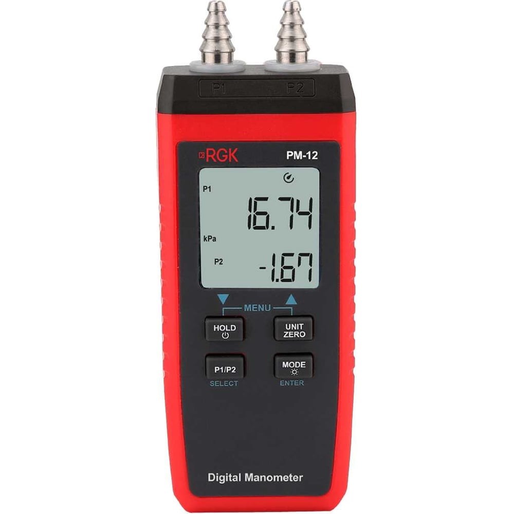 Двухканальный прибор для измерения манометрического и дифференциального давления, который часто используется при настройке и пусконаладке систем вентиляции, отопления и любых других, где есть движение воздушных масс. Высокая мобильность и производительность: Компактный цифровой манометр RGK PM-12 удобно брать с собой для замеров в полевых условиях, на производственных и промышленных предприятиях. Вокруг штуцеров расположены кольца светодиодной индикации, по которым можно сразу понять, какое давление в каждом канале - отрицательное или положительное. Такая особенность делает прибор актуальным решением для быстрых точечных исследований со взятием множества проб. HOLD: Кнопка HOLD служит для фиксации полученных показаний на дисплее. Она упрощает документирование при тестировании в труднодоступных местах и в любых других ситуациях, когда нельзя сразу считать данные. Удобная работа в темноте: Подсветка дисплея делает работу в слабоосвещенных помещениях, где часто располагается вентиляционное и отопительное оборудование, более комфортной и безопасной. Расширение функционала: К цифровому манометру RGK PM-12 можно подключить трубку Пито, что позволит определять скорость воздушного потока при работе с вентиляционными системами. Автоотключение: Устройство автоматически выключается, через 5 минут бездействия, что помогает продлить срок службы элементов питания.