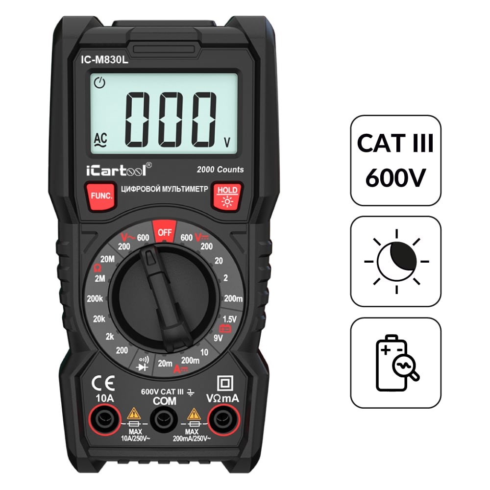 Мультиметр iCartool IC-M830L - надёжный универсальный тестер для дома, сервиса и производства. Подсвечиваемый дисплей на 2000 отсчётов, ударозащитный бампер и двойная предохранительная защита входов и подставка делают работу безопасной и удобной. Что измеряет: Переменное/постоянное напряжение (AC/DC) Постоянный ток Сопротивление Прозвонка цепей Тест диодов Тест батареек 1,5/9 В Стоп-кадр Ключевые преимущества Электробезопасность CAT III 600 V 2000 отсчётов — стабильная читаемость в рабочих диапазонах Подсветка дисплея — видно в слабоосвещённых щитовых, под панелью авто и т. п. Ударозащитный бампер (съёмный) демпфирует удары и защищает корпус Автоотключение — бережёт батарею при забывчивом использовании Продуманная эргономика: петля для подвеса, подставка для «свободных рук», крепления для щупов, крупные символы Применение Дом и ремонт: проверка розеток и выключателей, поиск обрыва в удлинителе, диагностика бытовой техники (блоки питания, батарейки 1,5/9 В) СТО: проверка бортовой сети 12 В, поиск «паразитных» потребителей, диагностика датчиков и проводки Слаботочка и IT: тестирование кабелей, проверка питания роутеров и камер Освещение и электромонтаж: проверка драйверов и лент (сторона 220 В/низковольтная), контроль уровня напряжения Производство и сервис: оперативный контроль питания стендов и приборов, входной контроль батареек и адаптеров