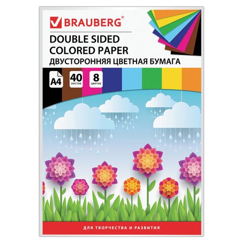 Цветная бумага А4 ТОНИРОВАННАЯ В МАССЕ, 40 листов 8 цветов, склейка, 80 г/м2, BRAUBERG, 210х297 мм, 124714