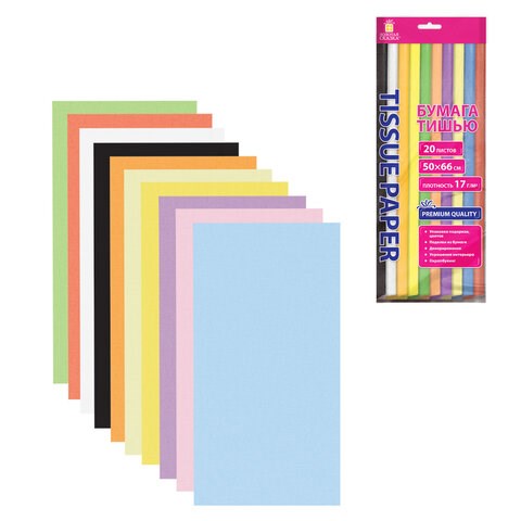 Набор бумаги пастельного тона состоит из 20 листов, представленных в 10 цветах, формата 50х66 см и имеет плотность 17 г/м2. Бумага упакована в пакет с отверстием для подвешивания. Если вы творческий человек и увлекаетесь поделками из бумаги тишью, то благодаря данному отверстию вы можете организовать хранение бумаги в наглядном, доступном месте, подвесив ее над своим рабочим местом. Ваши творческие идеи оживут от одного прикосновения к этой бумаге! Она позволит вам раскрыться в полной мере, как дизайнеру, при оформлении подарков на свадьбы, дни рождения, памятные даты!