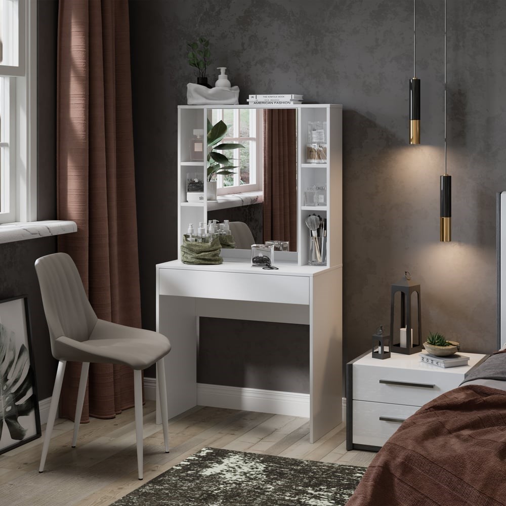 Туалетный стол «Салли» станет модным украшением интерьера и практичным элементом в вашей квартире. Помимо внешней привлекательности стол имеет большое зеркало, за которым размещены скрытые полки для хранения всех необходимых аксессуаров и косметики. Наличие открытых полок позволит установить предметы декора, а практичный выдвижной ящик добавит места для необходимых мелочей. В этом туалетном столике нет ничего лишнего, только самое необходимое для уголка женской красоты. Количество полок ЛДСП: 6 Количество дверей: 1 Тип направляющих ящиков: шариковые Тип сборки: не универсальный Размер двери с зеркалом: 680х474 мм Открывание: захватом руки снизу Петли: без доводчика (можно заменить на петли с доводчиком вкладные) Нагрузка на крышку стола: 20 кг Нагрузка на ящик: 5 кг Полезное пространство ящика: 707х341х96 мм
